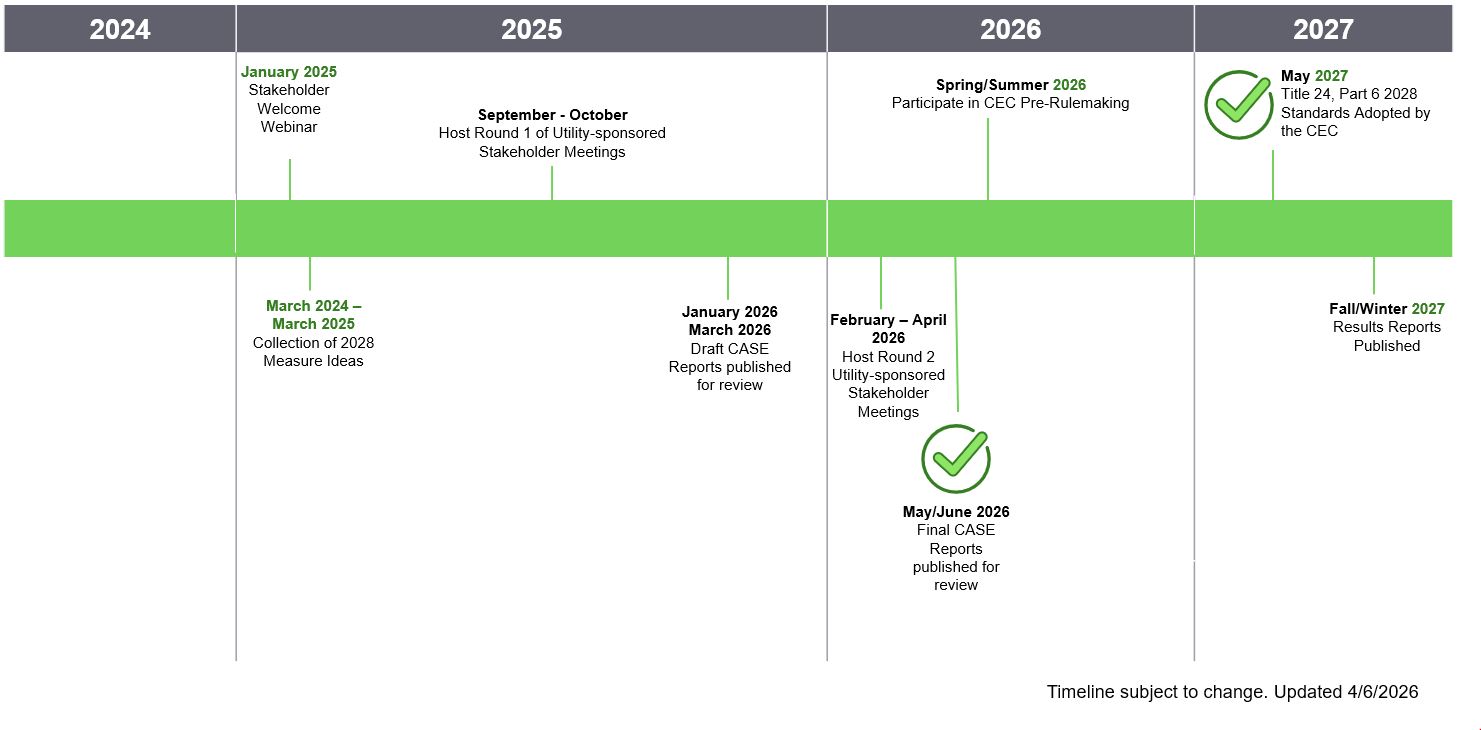The Statewide Codes and Standards Enhancement (CASE) Team periodically distributes email notifications that promote upcoming meetings, provide materials from past meetings, and update stakeholders on the progression of the California Energy Commission (CEC)’s rulemaking process. You can choose to receive measure-specific and/or general updates on these topics depending on your needs.